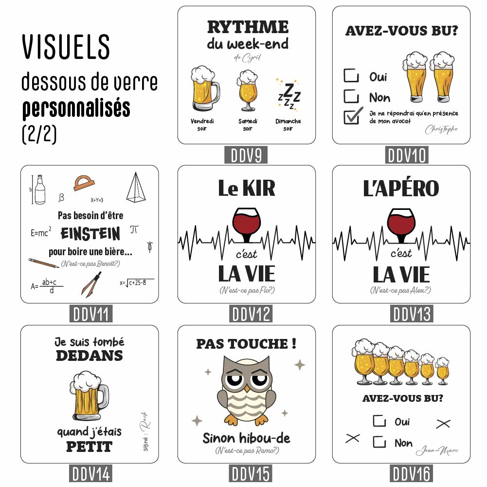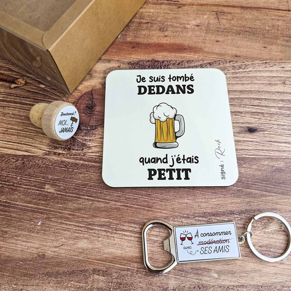 Un coffret apéro unique : choisissez vos visuels préférés et ajoutez votre prénom ou un petit mot sur le dessous de verre. Le cadeau fun et vraiment perso !