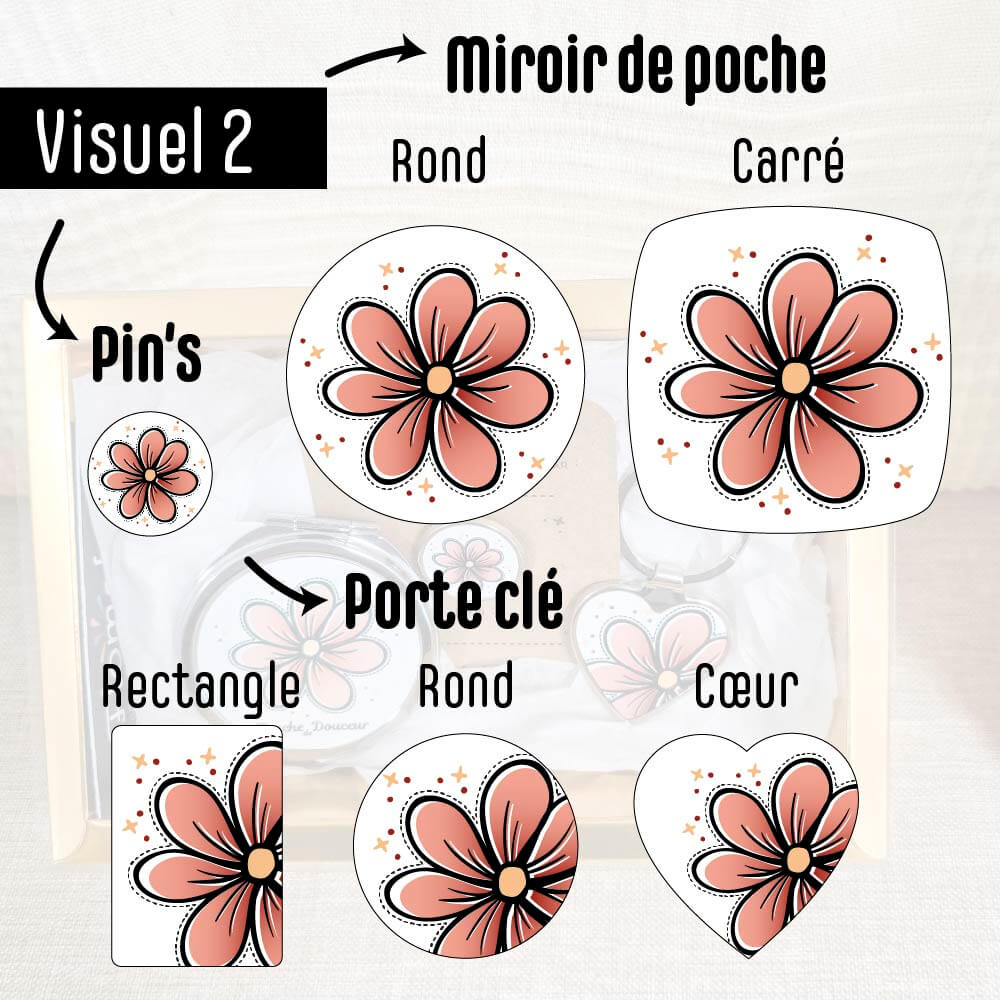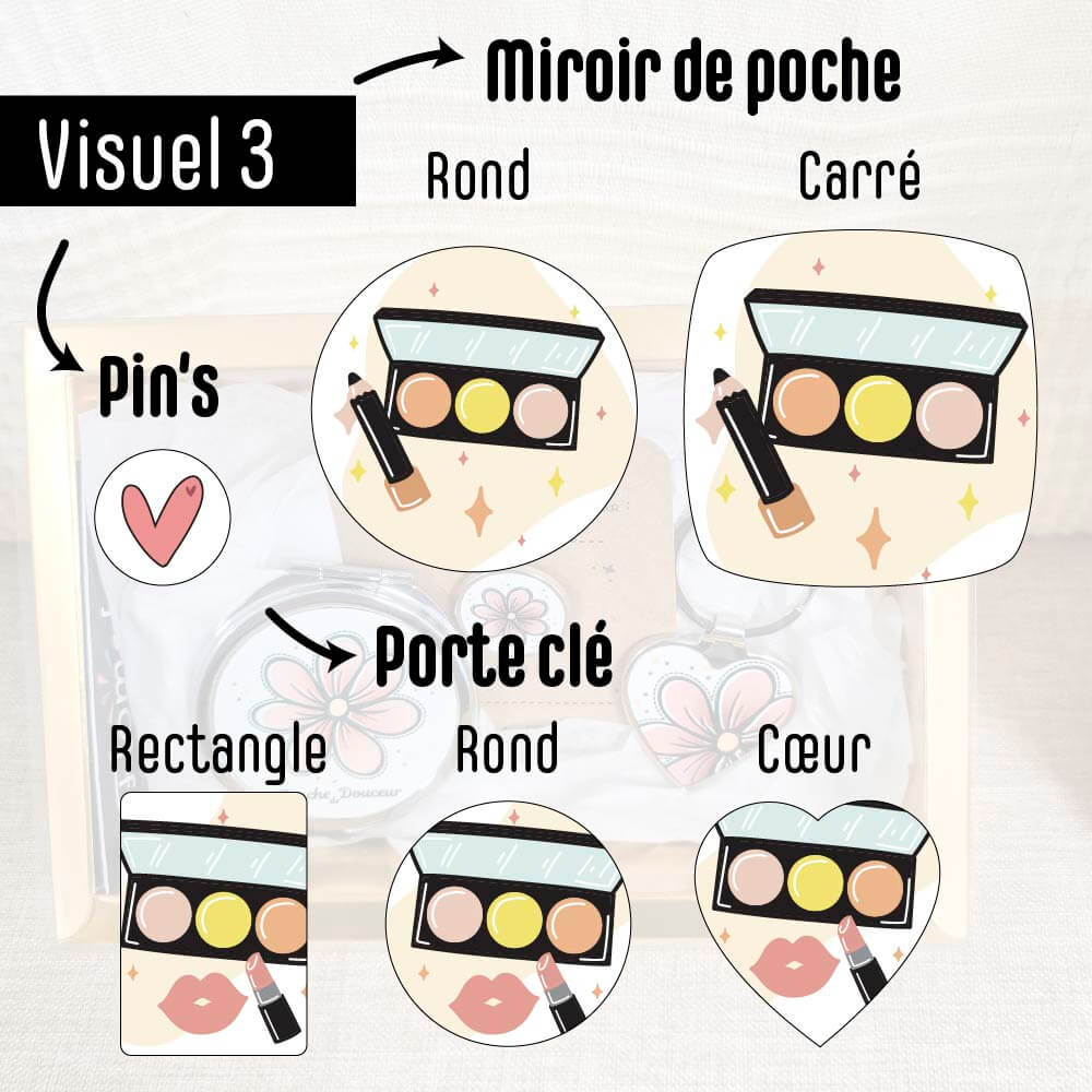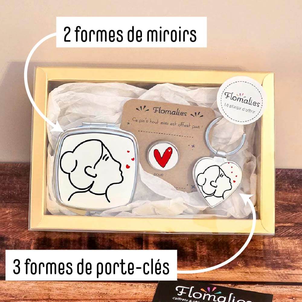 Le Coffret « Mini Chic » réunit un miroir de poche, un pin’s et un porte-clé, pour une petite attention élégante et 100% personnalisable.