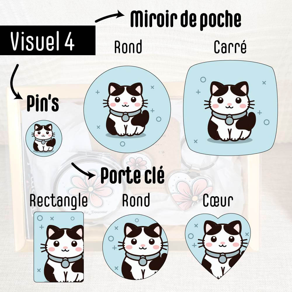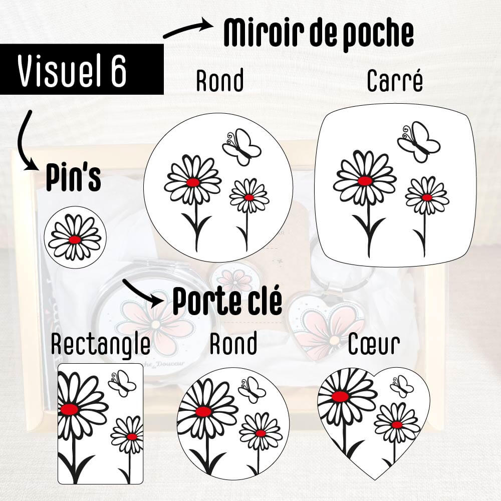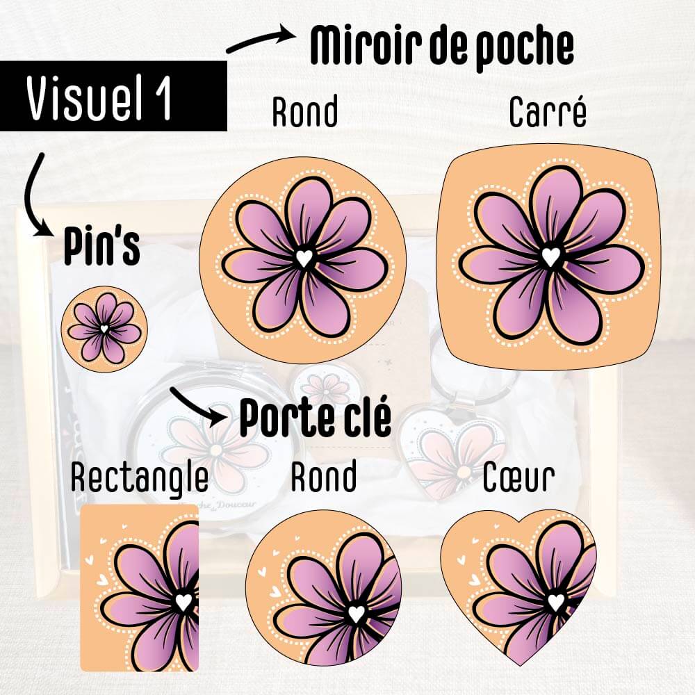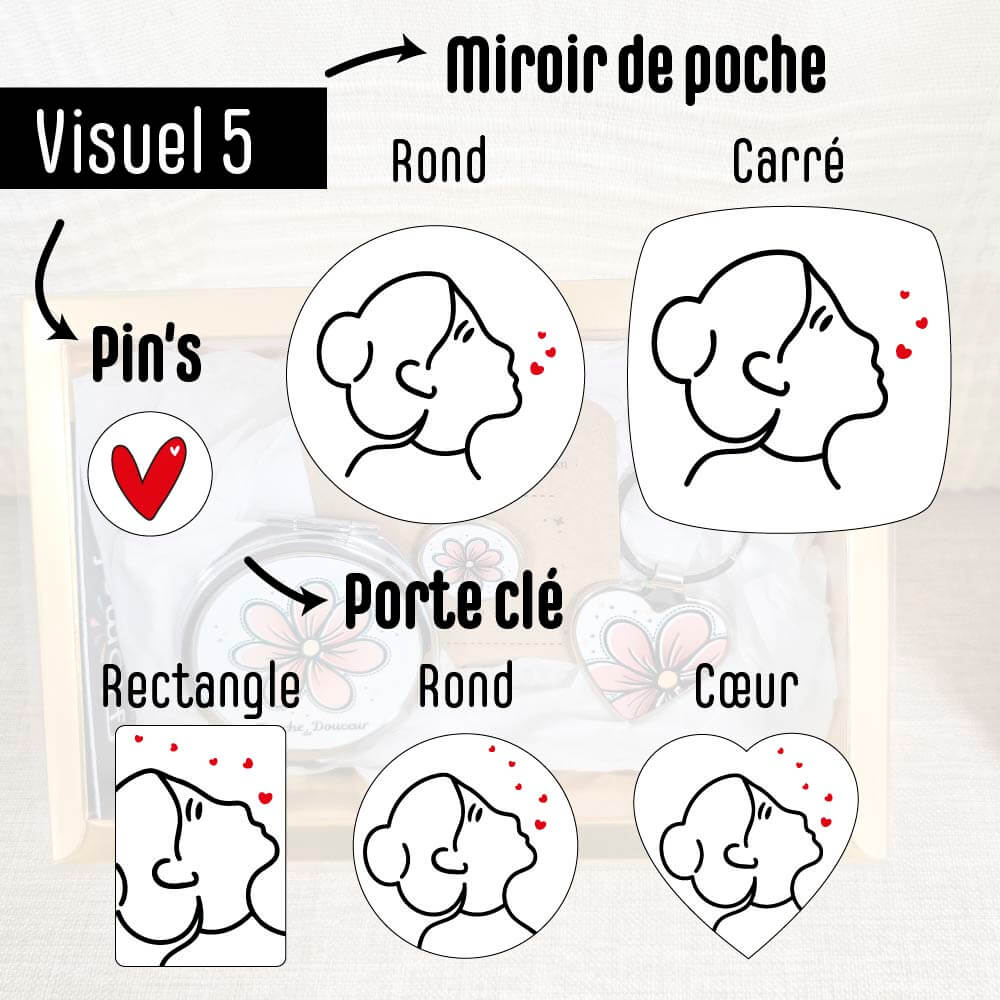 Le Coffret « Mini Chic » réunit un miroir de poche, un pin’s et un porte-clé, pour une petite attention élégante et 100% personnalisable.