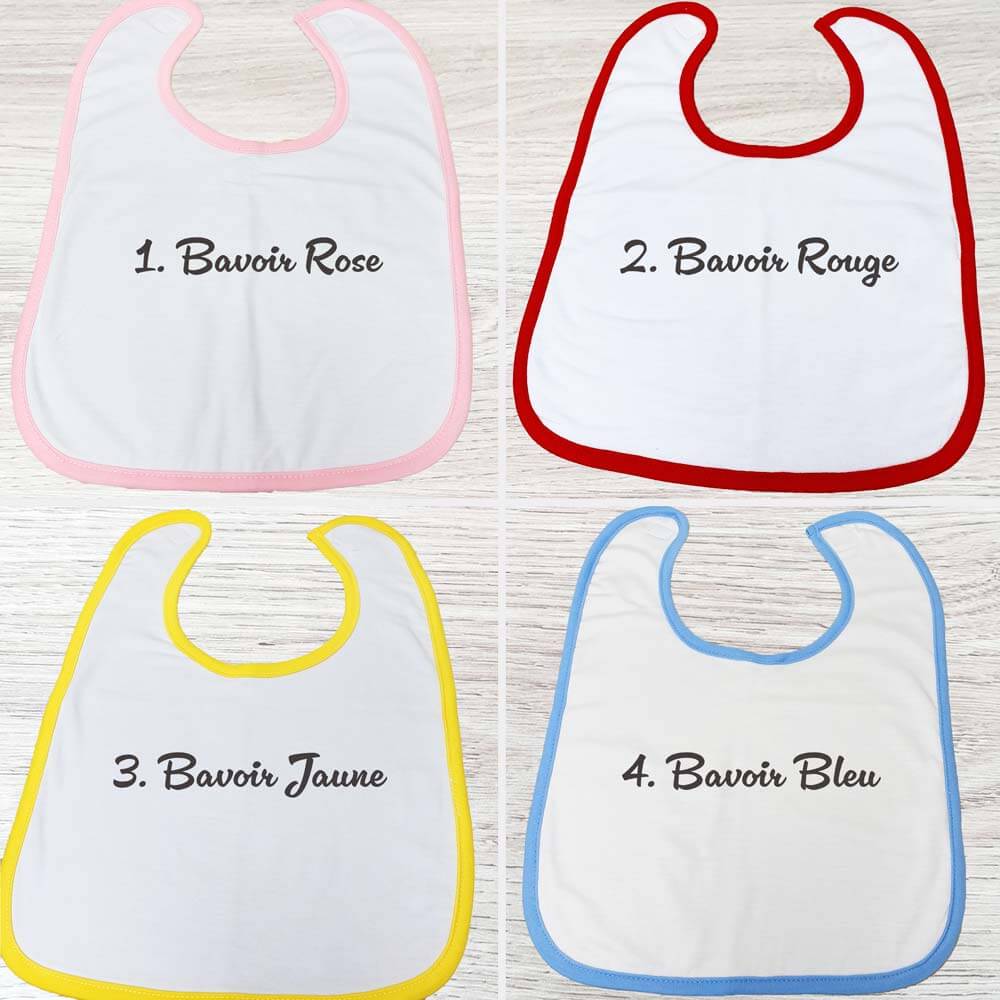 • d’un bavoir avec différents coloris disponibles. 100% polyester, avec doublure éponge. Fermeture « scratch ». Dimension : 38×28.5cm.