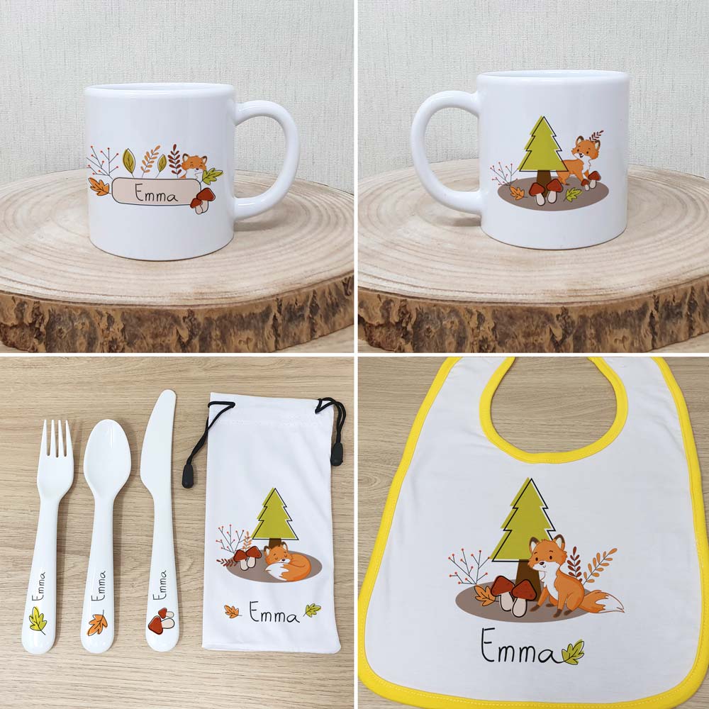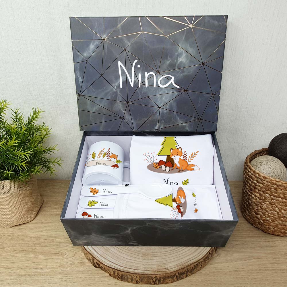 Coffret naissance personnalisé sur le THÈME DU RENARD pour un cadeau totalement unique et qui plaira à tous les coups !