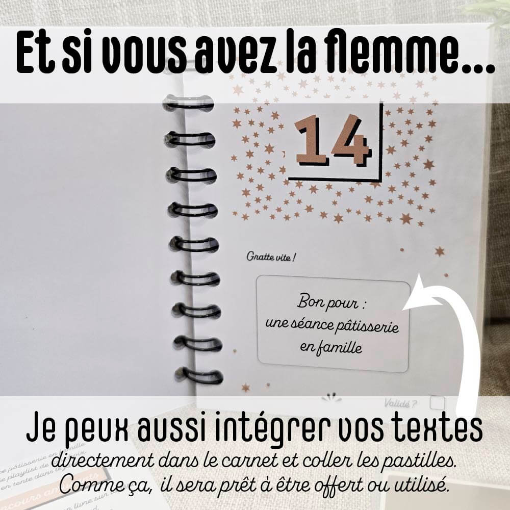 Si vous n’avez pas envie d’écrire tous les messages à la main et de coller les pastilles, je peux intégrer les messages dans les visuels et imprimer les pages directement avec vos messages, puis coller les pastilles. Les livret sera donc tout prêt à offrir.